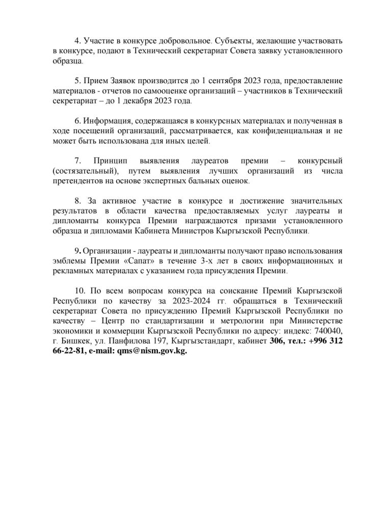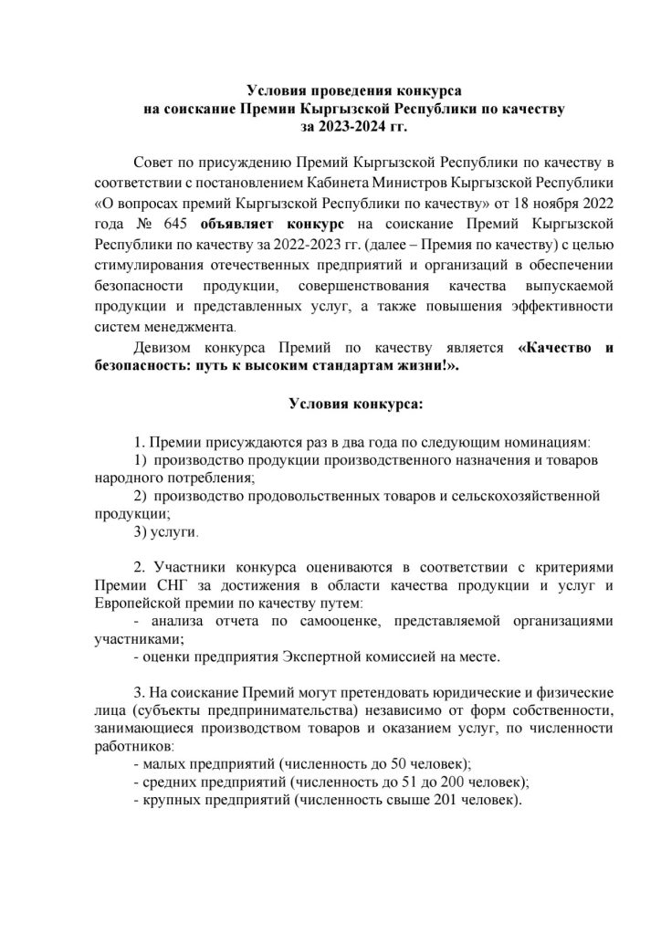 Ала-Букинская районная государственная администрация информирует Вас, что решением Совета по премиям качества КР объявлен конкурс на Премию КР по качеству на 2023-2024 годы по следующим направлениям: